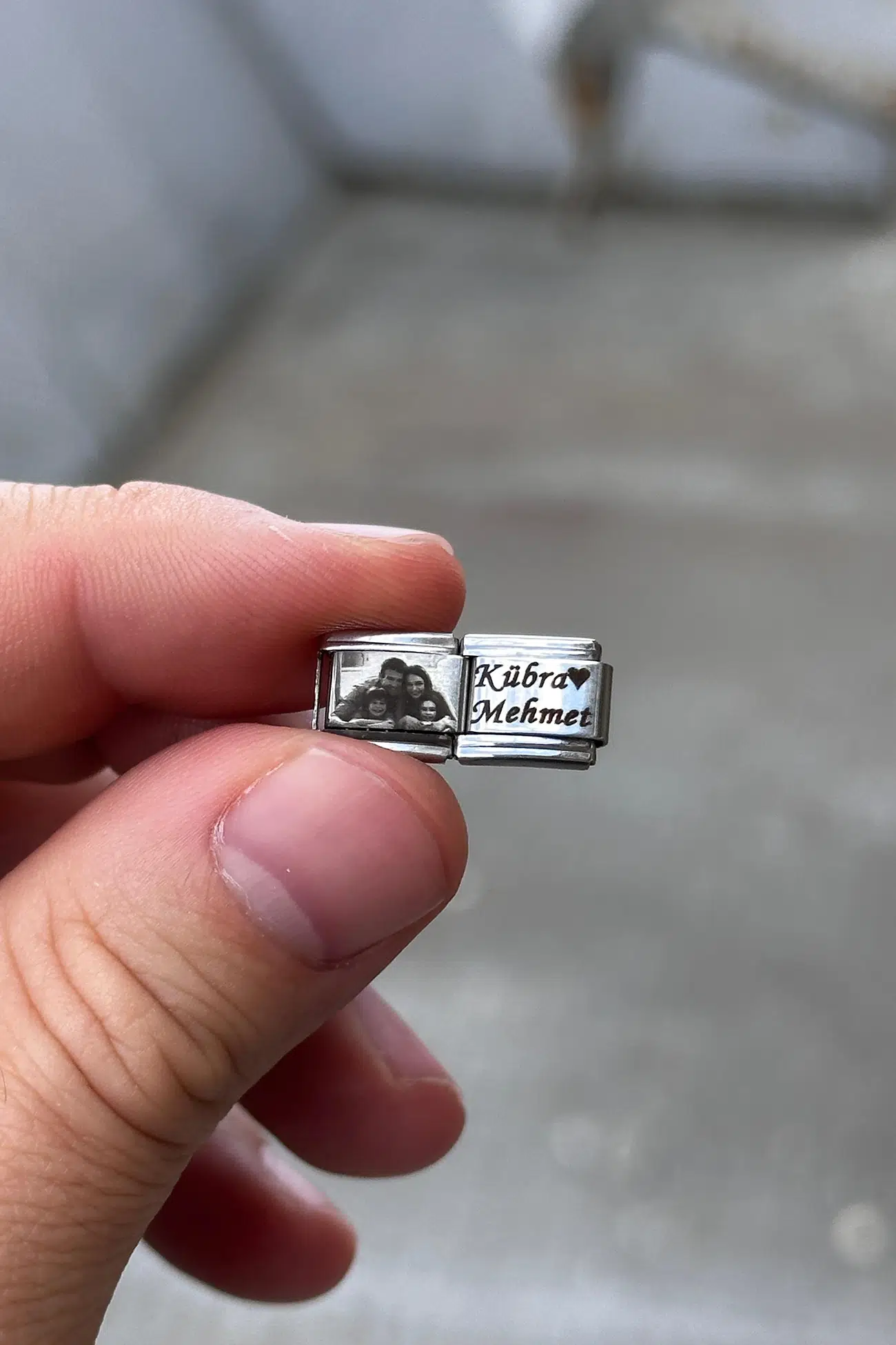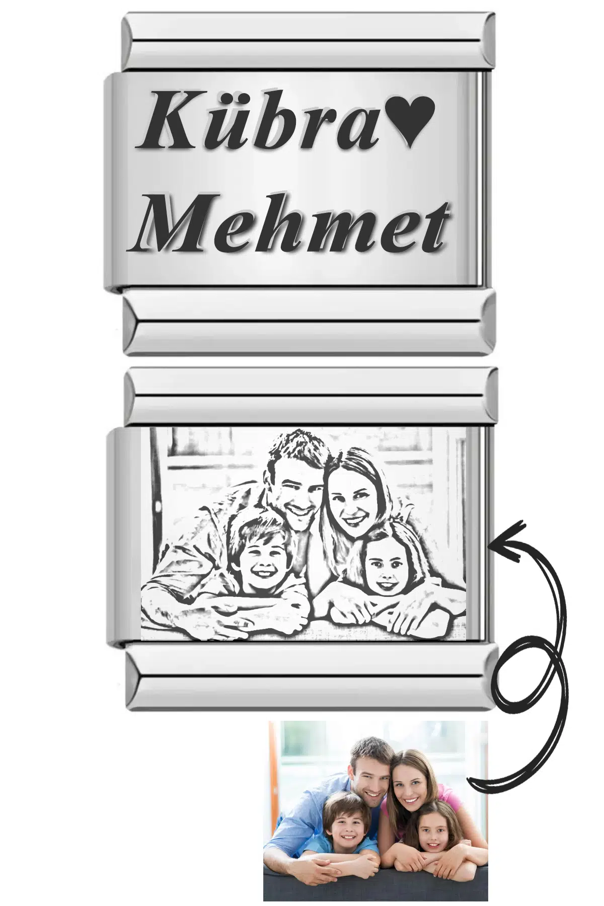 Üzerine 1 plakaya isim yazılır diğer plakaya göndereceğiz resim baskısı yapılır, Çok küçük bir parça olduğu için resmin ürünün üzerinde küçük görüneceğini hatırlatmak isteriz.